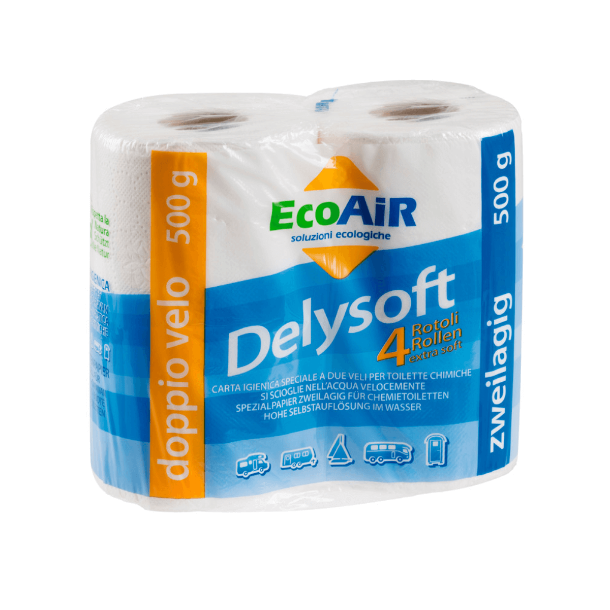Papel higiénico Delysoft EcoAir en pack de 4 rollos de doble capa, especial para WC químicos de campers, caravanas y autocaravanas. Su rápida disolución evita atascos y garantiza suavidad y comodidad en cada uso.