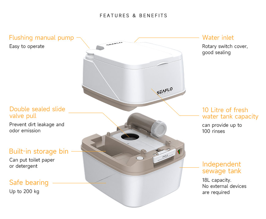 El inodoro portátil SEAFLO multifunción combina funcionalidad, comodidad y diseño innovador para un uso móvil eficiente. Fabricado mediante moldeo por inyección en material PP ecológico, ofrece un acabado suave y texturizado, con gran ligereza y durabilidad.