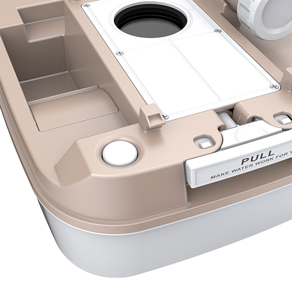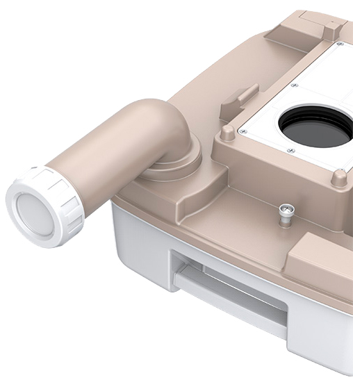 Cuenta con un botón de escape en el tanque de aguas residuales que evita salpicaduras durante el vaciado y un indicador de nivel de líquido mediante desplazamiento de color, evitando desbordes. La salida de aguas residuales es giratoria 270°, facilitando la limpieza. Además, el nuevo depósito incorporado permite almacenar detergente o papel higiénico para mayor comodidad del usuario.